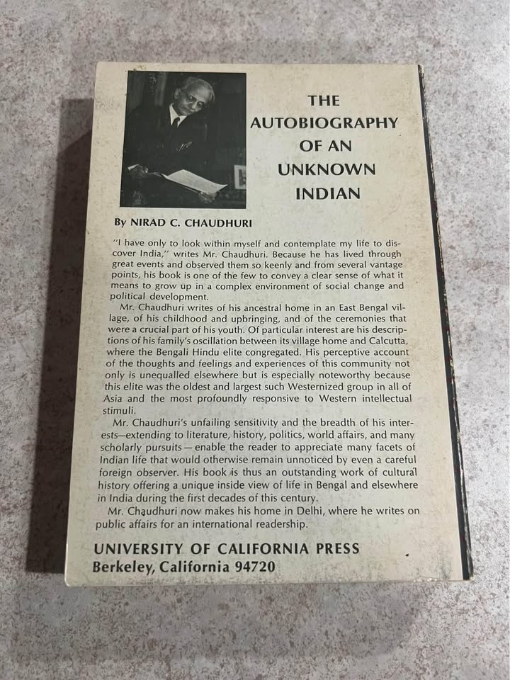 1968 The Autobiography of an Unknown Indian by Nirad C Chaudhuri Vintage Paperback Book